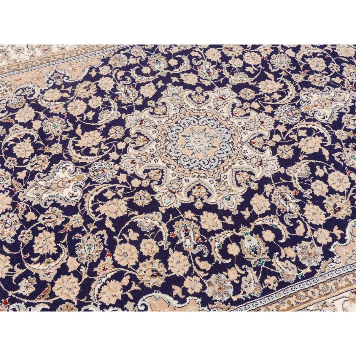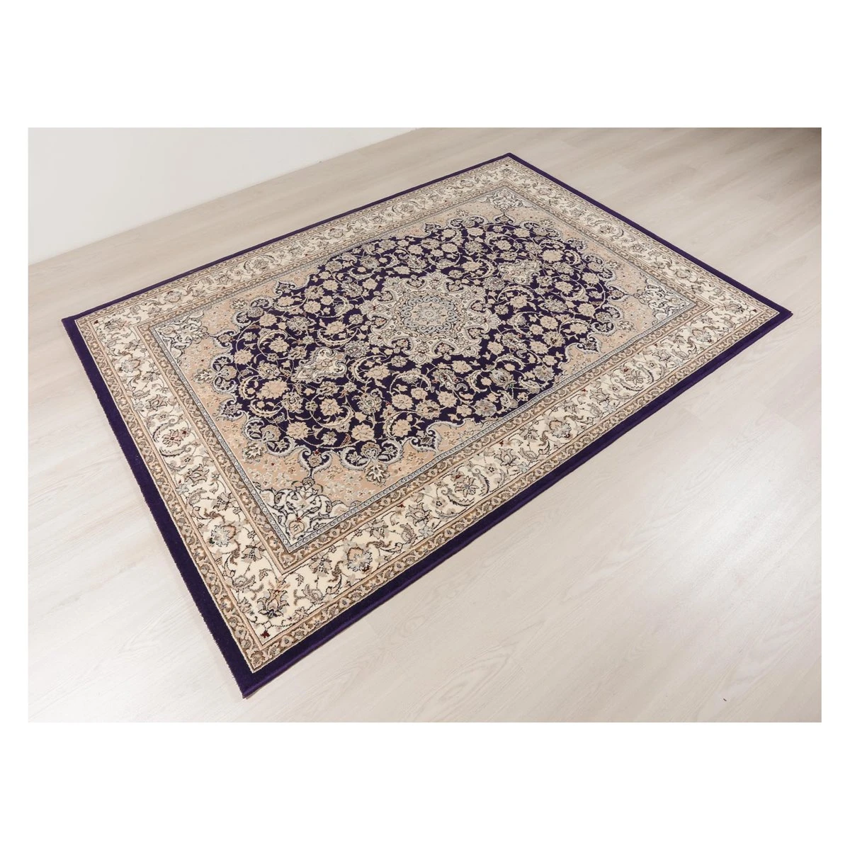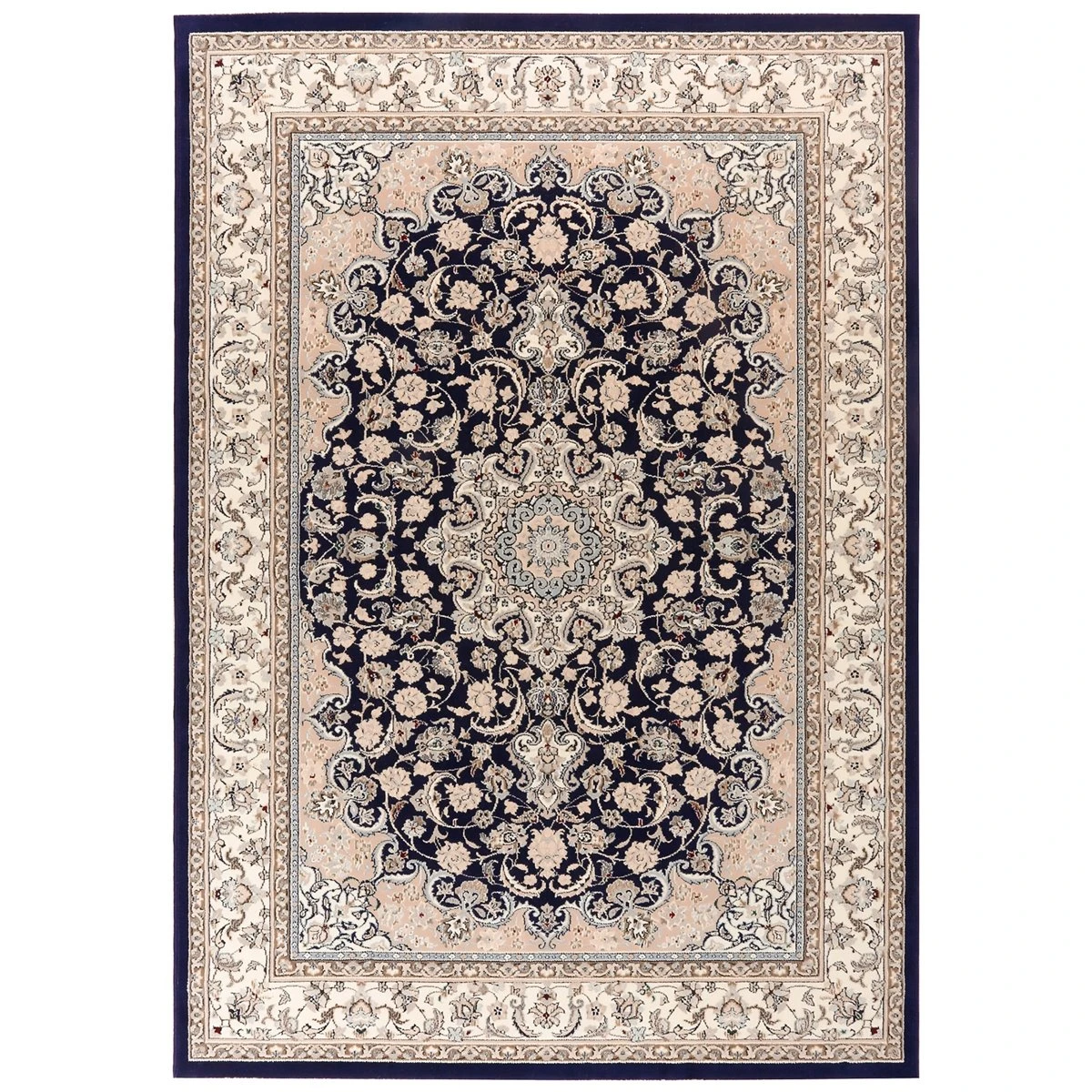 Alfombra clásica de pura lana virgen 100% con medallón central de estilo neoclásico modelo Azahar 51 en color azul marino y beige.