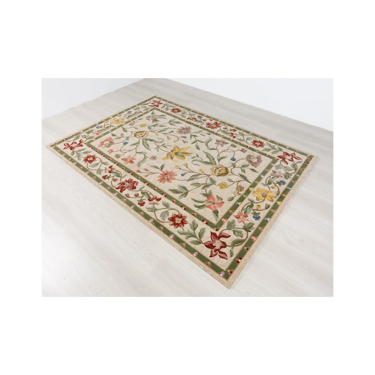 Alfombra de pura lana 100%, tejida en Crevillent, con un dibujo de flores muy elegante, totalmente exclusivo de Mundoalfombra, que combina una amplia variedad de colores: vainilla, rosa, lila, azules, rojos, sobre una disposición de hojas grandes, y un fondo beig claro, que crean una alfombra confortable, atemporal, con muy buena apariencia, adecuada para colocar en sala o salón comedor.