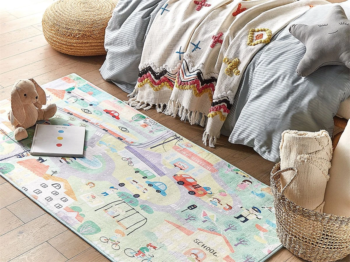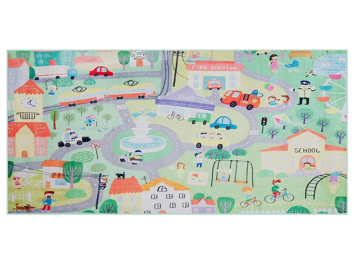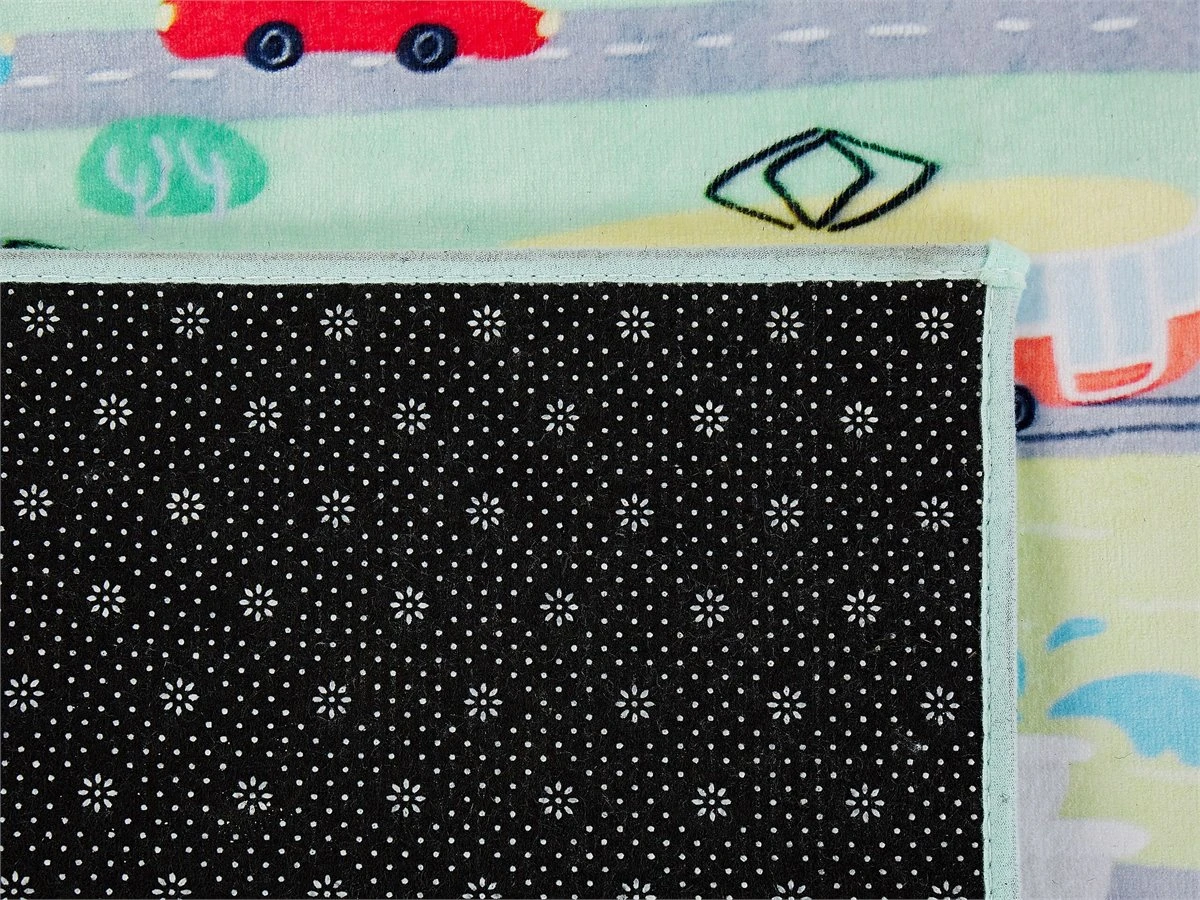 Alfombra de habitación infantil. Esta alfombra es ideal para cualquier habitación infantil o sala de juegos. Está fabricada a partir de poliéster de alta calidad, suave al tacto y de bajo mantenimiento. El patrón de pueblo fomenta la imaginación de los más pequeños. La parte antideslizante protege de un posible resbalón. Detalles: Tipo de Producto: Alfombra para niños Estilo: Moderno Color: Multicolor Tipo de material: Tejido Material principal: Poliéster Material de respaldo: Poliéster Composición del Material: 100% Poliéster Forma: Rectangular Parte inferior antideslizante: Sí Densidad: 500 Diseño: Impreso Apto para calefacción por suelo radiante: Sí Costura: 3D Dimensiones: Altura del pelo: 1 cm Ancho: 80 cm Longitud: 150 cm Peso: 1 kg La oferta incluye: 1 x Alfombra Ventajas: Apto para calefacción por suelo radiante, El fondo antideslizante evita que la alfombra se mueva, Ofrece posibilidades de juego ilimitadas, Colores vivos, El borde cosido evita que la alfombra se deshilache Información de montaje: No requiere montaje Información adicional: Después de desembalar, el producto tarda aproximadamente 72 horas en obtener la forma deseada. Para conseguir el mejor resultado, recomendamos desdoblarlo lo antes posible y colocar un peso en los extremos. Consejos de mantenimiento: Poliéster: 1.Periódicamente, gire su alfombra 180 ̊ para garantizar un desgaste uniforme y evitar la decoloración causada por la exposición al sol 2.Para manchas difíciles, límpie la superficie con un paño de algodón húmedo que no manche. Si es necesario, use un líquido de lavado de lana. No moje demasiado la alfombra y sequela después de limpiar. Use solo limpiadores recomendados para alfombras. Póngase en contacto con un experto para la eliminación de manchas difíciles 3.Aspire una vez por semana con una potencia de succión media utilizando un accesorio de tapicería, en la dirección de la pila 4.Para un uso cómodo, recomendamos ventilar la alfombra desempacada durante al menos unas horas (lo mejor sería uno o dos días. Esto permite que el olor natural del material se desvanezca 5.Elimine cualquier mancha inmediatamente con un paño húmedo que no manche. Limpie desde el borde hasta la mitad de la alfombra, no frote.