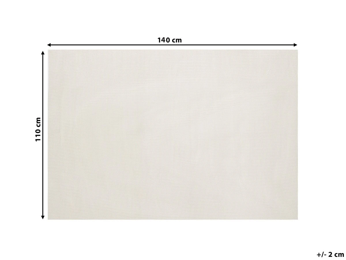 Alfombrilla antideslizante. Esta estera mantiene la alfombra fija al piso y evita posibles peligros o accidentes. Fabricada a partir de PVC resistente e impermeable, funciona bien en superficies secas o húmedas. Fácilmente recortable a la dimensión deseada. Detalles: Tipo de Producto: Alfombra antideslizante Estilo: Tradicional Color: Blanco Tipo de material: Material sintético Material principal: PVC Composición del Material: 100% Polietileno Forma: Rectangular Parte inferior antideslizante: Sí Apto para calefacción por suelo radiante: No Dimensiones: Altura del pelo: 0.2 cm Ancho: 110 cm Longitud: 140 cm Peso: 1 kg La oferta incluye: 1 x Alfombra antideslizante Ventajas: El fondo antideslizante evita que la alfombra se mueva, Material ligero y durable, Alta calidad, Ideal para el salón o la oficina, Multifuncional Información de montaje: No requiere montaje Información adicional: Puede perder pelo de forma ocasional. Se trata de un proceso natural y no un defecto de calidad del producto. Consejos de mantenimiento: PVC: 1.Lavar a mano, usar agua fría y un limpiador suave 2.No usar secadora y no planchar.