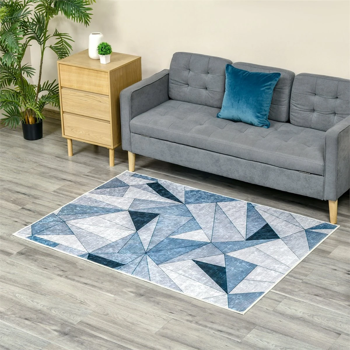 - – Alfombra con patrón estampado de triángulos geométricos en color azul, gris, negro y blanco con diseño overlocking