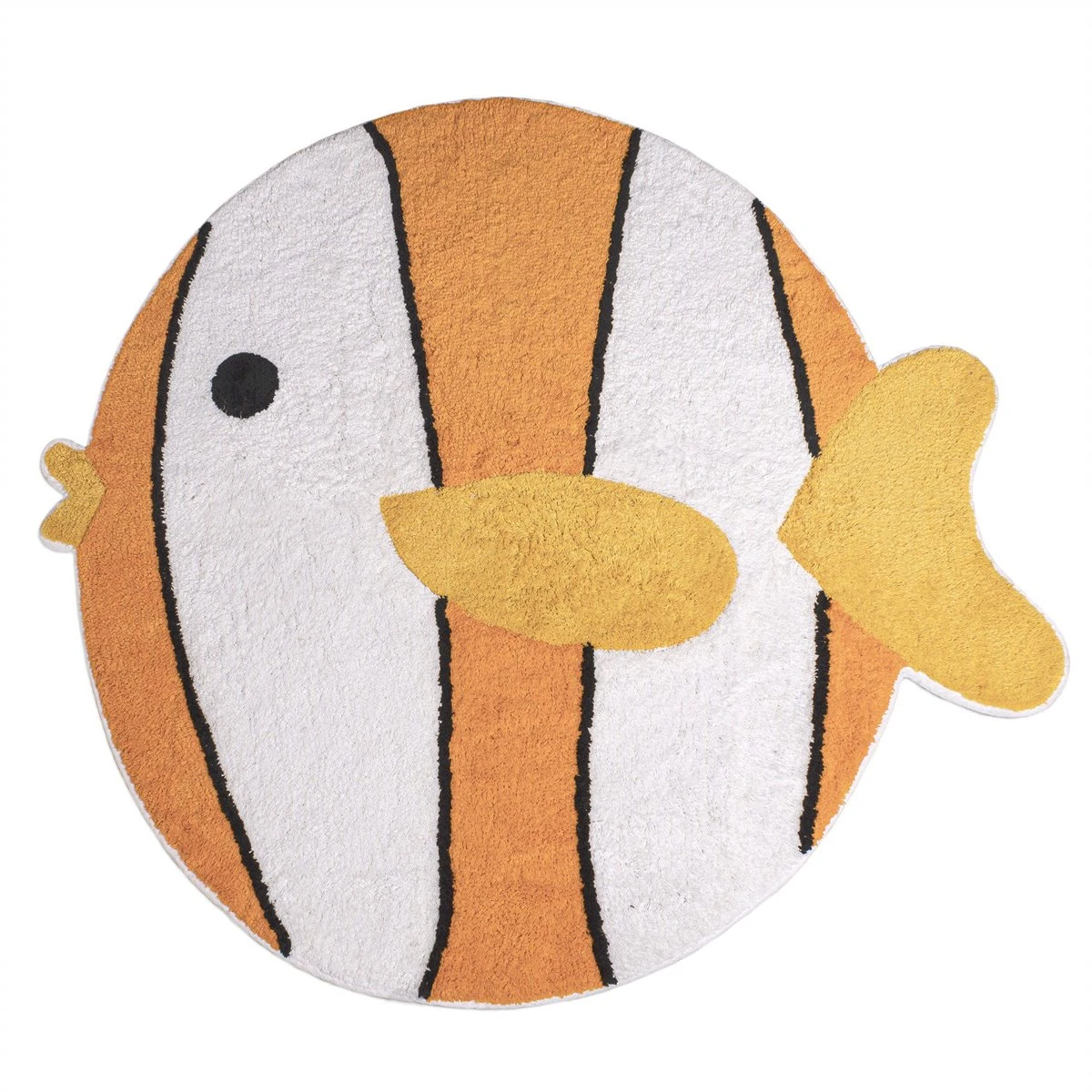 Descubre el maravilloso mundo submarino con la alfombra HAPPY FISH en forma de pez globo y sus llamativos colores naranjas. Esta alfombra infantil de 110x120cm está elaborada artesanalmente con hilos 100% algodón y teñida con tintes no tóxicos, para el mayor confort y seguridad de tu peque. ¿Qué pequeño aventurero no querrá soñar con el maravilloso océano y vivir una bonita historia bajo del mar? Coloca esta alfombra en la habitación de juegos o a los pies de la cama. Incluye: – 1 x Alfombra 110×120.